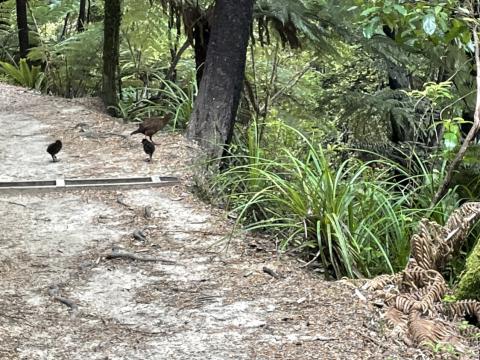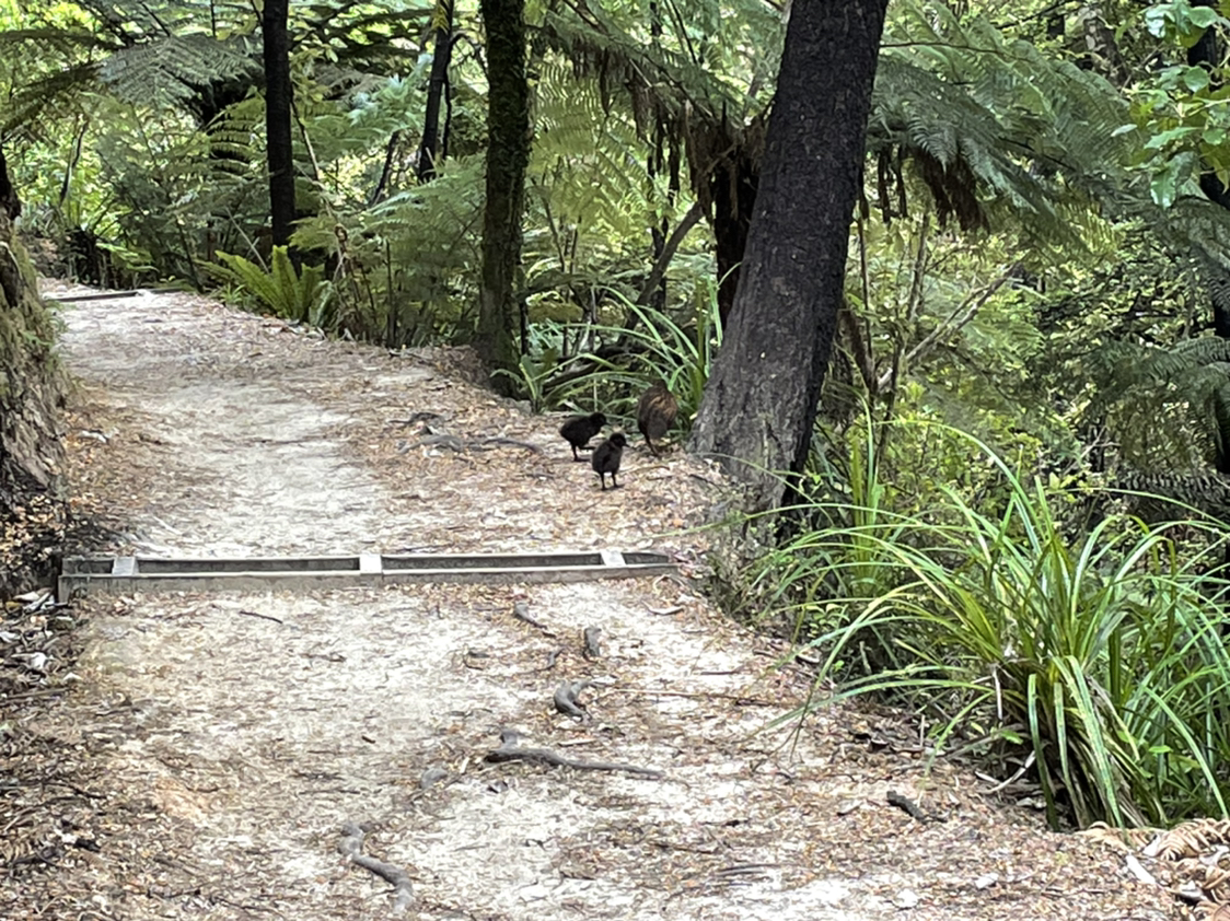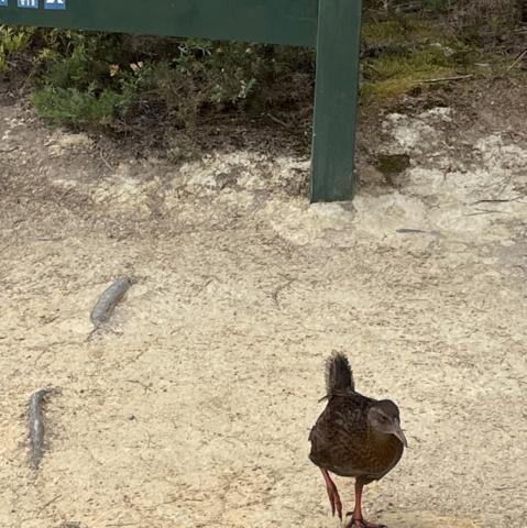 Saw 2 adults and two chicks near Tree with 44 triangle mark, saw single weka near watering hole sign below and another singke adult at Coquille bay- have the video of it walking along the path if you want- apologies fir double ups if photos as cant seem to remove them